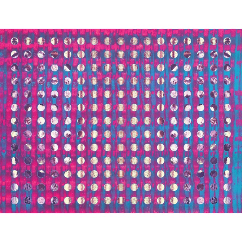 L'année s'écoule donc, et avec elle comme ruisselante la trame de fond du premier champs, sur lequel l'autre trame, la grille des éléments circulaires semble glissée, et se posée, atterrir. Les deux trames ne sont plus superposées l'une au dessus de l'autre, de façon paroxystique comme dans le tableau-combo précédent du mois de janvier, mais elles se rejoignent, se fondent l'une dans l'autre, alors que se précise au cœur de l'abstraction, sur le plan du tableaux des zones distinctes, un ordre nouveau, ou un monde parallèle prêt à éclore. L'espace pictural n'est pas là, pour traiter de façon anecdotique des frimas saisonniers que l'on s'accorde à associer au moi de février, mais pour signifier un commencement, les prémices d'une chronologie.